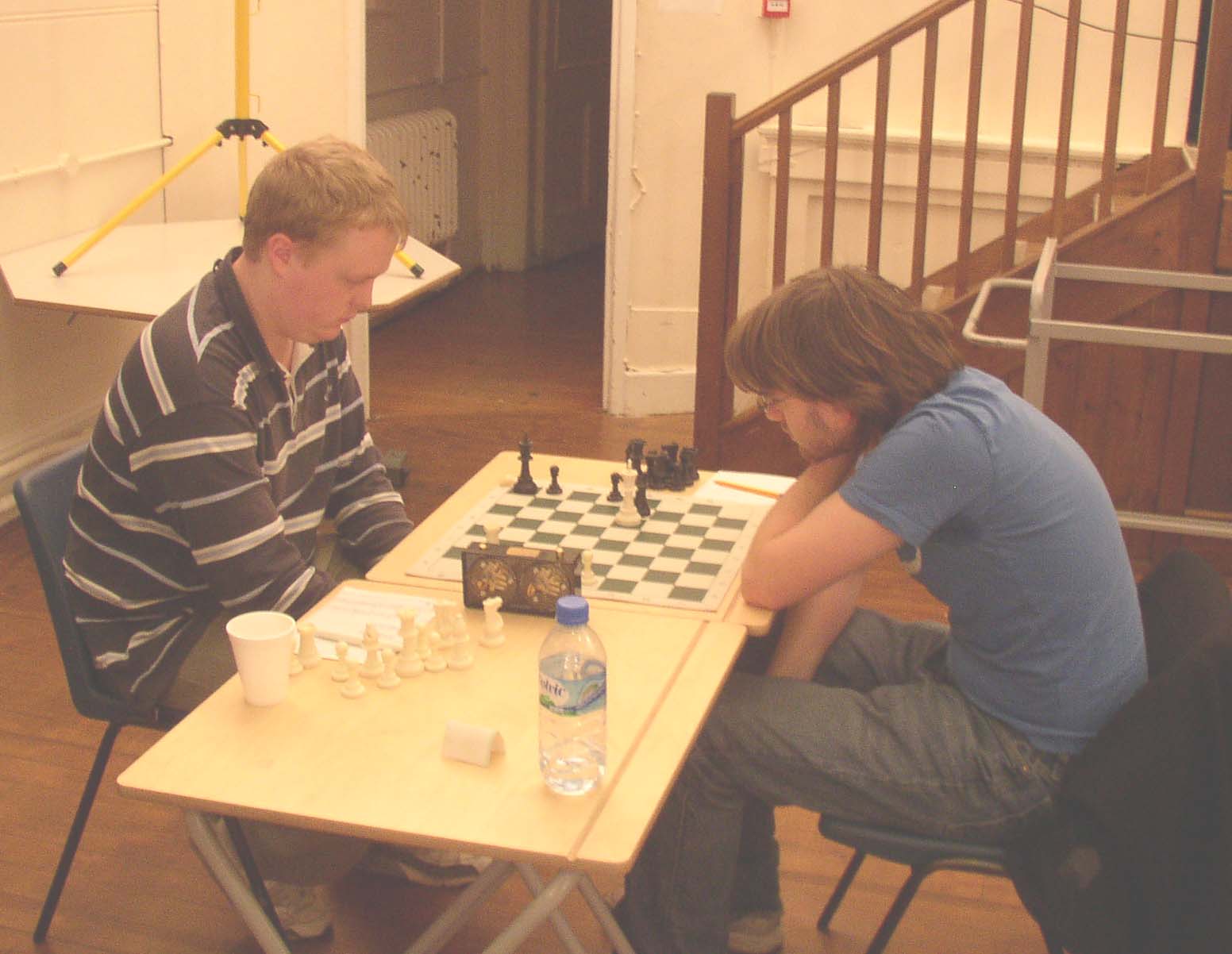 December 2007 Dec 30th - Updated Results File - Results.xls Dec 20th - Downend ''On the Buzzer'' Tournament - Download Full details New Years Day - Tuesday Jan 1st 7.00 pm - 11.00 pm - Please arrive early for prompt start Adults £1.50 Juveniles 50p Continuing the tradition of this event, competitors are invited to bring along 'unwanted Christmas presents' for distribution as minor prizes. Dec 10th - Chris Dorrington wins the Bristol Open 4½/5 after a tense final round draw against Michael White. Download - 27 games from the Open Section Cbv Pgn